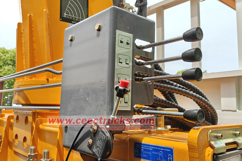 ● Работа телескопической стрелы: Четырехсекционная стрела выдвигается секция за секцией с помощью гидравлического цилиндра, а увеличенный радиус действия может достигать 16 метров. Конец стрелы оснащен полиспастом и тросом для подъема тяжелых предметов.