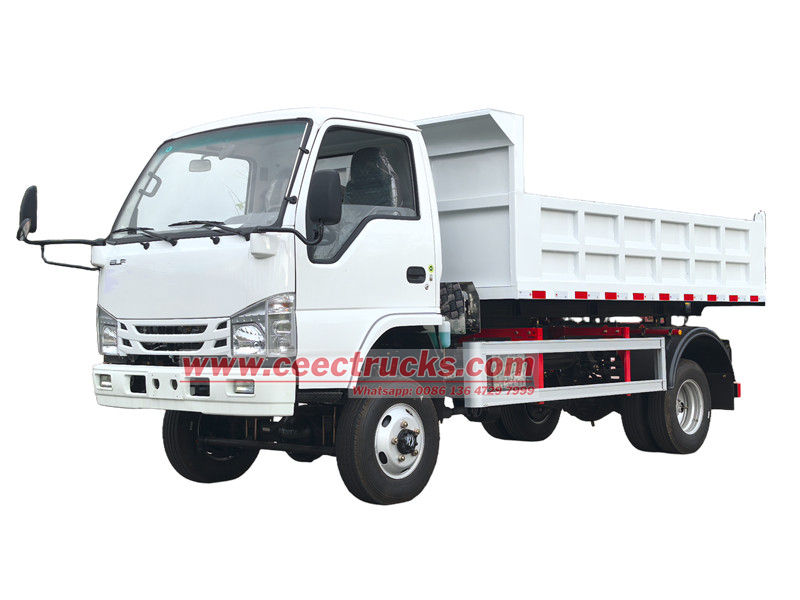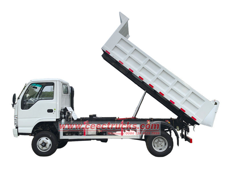 Малый самосвал Isuzu 2 тонны модифицирован на базе шасси Isuzu ELF NKR, с колесной базой 3360 мм, оснащен дизельным двигателем Isuzu 120 л.с. 4KH1CN6LB, 5-ступенчатой коробкой передач Isuzu MSB-5, и самосвальным кузовом из углеродистой стали с днищем 4 мм, боковыми и передними стенками 3 мм. Габариты 3550×2100×550 мм, центральный подъем, устойчивый подъем, чистая и быстрая разгрузка, задние двери открываются, а управление транспортным средством осуществляется с помощью распределителя на стороне водителя, что обеспечивает простоту эксплуатации.