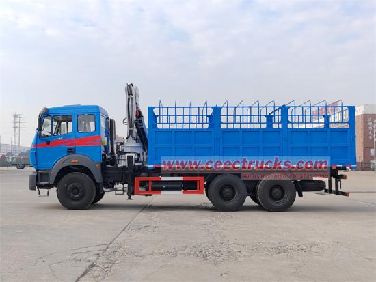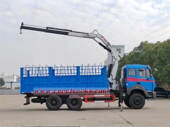 Грузовой кран Beiben со складной стрелой, модифицирован на базе шасси Beiben 2638 6x4, колесная база 4450+1450 мм, оснащен двигателем WEICHAI WP10.380E32 мощностью 380 л.с., выбросы EURO 3, быстрая 8-ступенчатая коробка передач, максимальная скорость 90 км/ч, верхняя загрузка - грузовой ящик складского типа, размер 6500x2500x1600 мм, материал - углеродистая сталь, толщина стенок 6 мм, днища 8 мм, и кран со складной стрелой XCMG SQ5ZK2Q: макс. подъемный момент 10,5 тм, макс. грузоподъемность 5000 кг, макс. высота подъема 10,08 м, макс. рабочий диапазон 8,01 м, 360 ° ВСЕ вращение, пролет аутригеров 5210 м, вес крана 2011 кг, система управления с 2 сторон крана.
