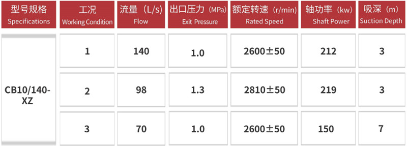 Номинальная производительность насоса составляет от 70 до 140 л/с, номинальное давление — около 1,0 МПа, а максимальный напор — более 100 метров. Он отличается быстрым запуском, высокой высотой всасывания и стабильной подачей воды. Высокая всасывающая способность обеспечивает быстрое самовсасывание (до высоты около 7 м при использовании с вакуумным водоотводным устройством).