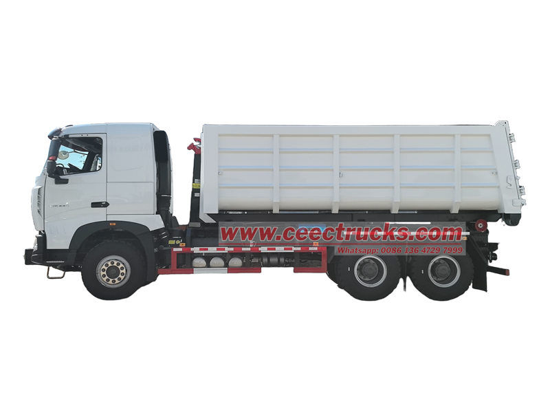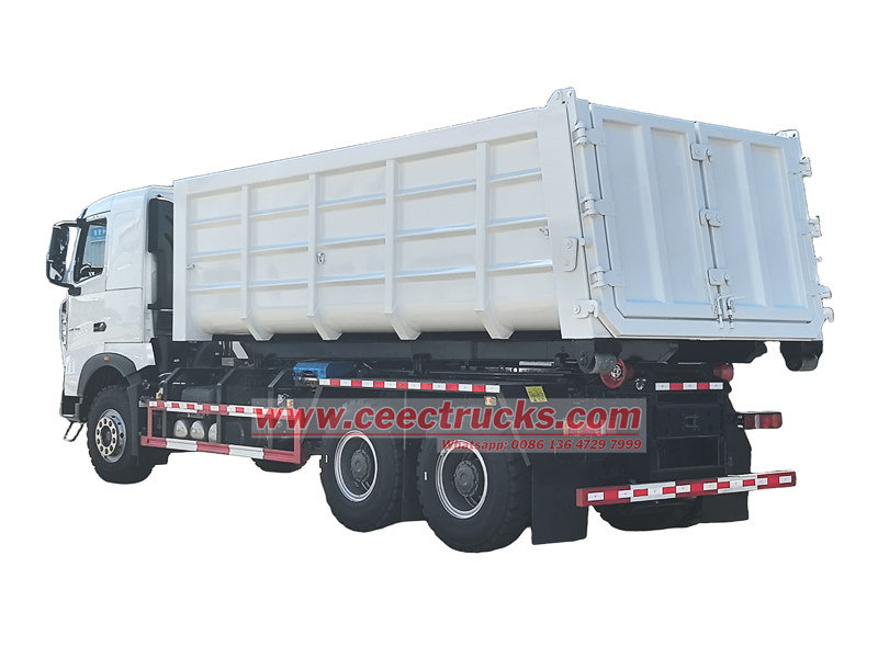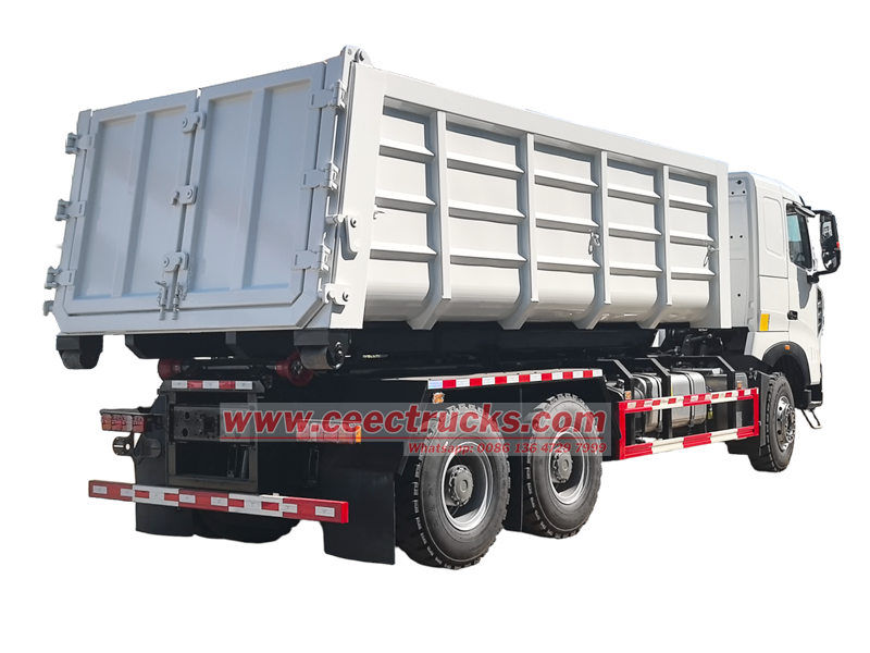 20-тонный крюковой погрузчик Howo — высокопроизводительная мусороуборочная машина. Его отличительной особенностью являются съемные шасси и тележка, оснащенные гидравлической системой крюкового захвата, которая обеспечивает быстрый подъем, погрузку, разгрузку и перемещение мусорных контейнеров, обеспечивая гибкость и удобство эксплуатации.