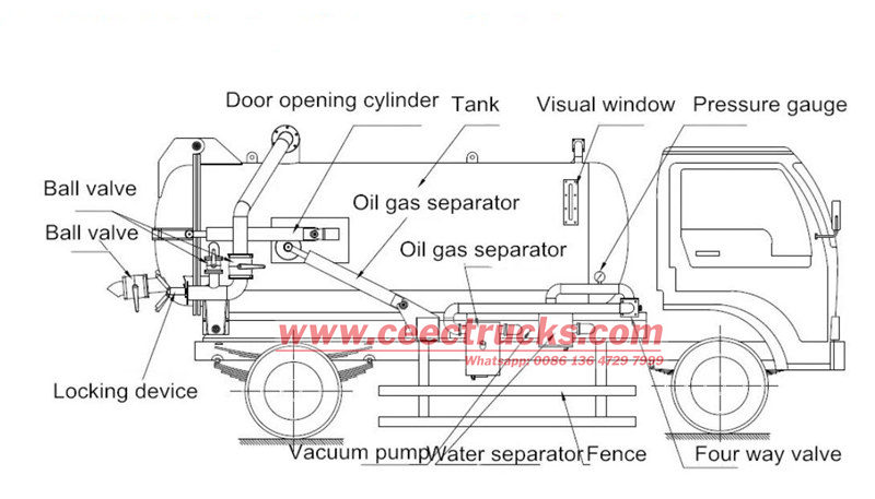 Верхняя часть оснащена импортным вакуумным насосом (марка может быть выбрана заказчиком) с высокой производительностью всасывания, что обеспечивает быстрое откачивание и перекачку сточных вод, шлама и осадка. Гидравлическая система позволяет поднимать резервуар и открывать заднюю крышку, что экономит время и силы при разгрузке и значительно повышает эффективность работы.