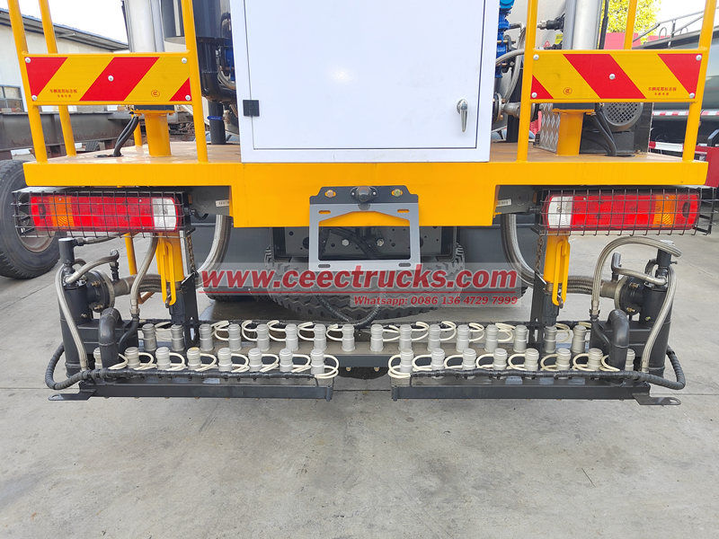 Задняя часть автомобиля оснащена выдвижной штангой распылителя (регулируемой длиной от 2 до 6 метров), оснащенной центробежным насосом высокого давления и веерным соплом. Ширина распыления и расход материала плавно регулируются (от 0,3 до 3 л/м²) с помощью бортового компьютера для удовлетворения требований различных процессов, таких как проникающее, прихватывающее и герметизирующее покрытие.