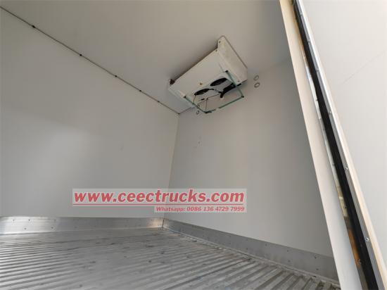 Рефрижератор HOWO 4x2, модифицирован на шасси легкого грузовика серии HOWO Leader, колесная база 3360 мм, оснащен двигателем Weichai WP3NQ160E61 мощностью 160 л.с., 6-ступенчатой коробкой передач Xingrui ML650A, верхним рефрижераторным кузовом 4100×2300×Размер 2050 мм, материал стекловолокна, FRP + пенополиуретан + FRP материал панели 105 мм, полностью закрытая сэндвич-панель, правая боковая дверь, полноразмерная двойная задняя дверь, нескользящий и износостойкий пол, неавтономный холодильный агрегат Carrier CITIMAX D6.