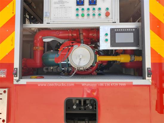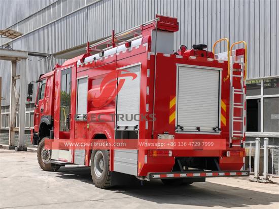 ЧтеHowo внедорожныйогненная водагрузовик использует Sinotruk 4x4 шасси повышенной прочности. Он оснащенМС11.40-40 двигатель с номинальной мощностью 400 лошадиных сил и механической коробкой передач с 12 передачами переднего хода и 2 передачами заднего хода. Howo4х4 Пожарная автоцистерна имеет емкость бака5000 л воды и 1500 л пены, изготовлен из полипропиленового композитного материала с антикоррозионными свойствами. На крыше установлен пожарный монитор с расходом 45 л/с и дальностью действия более 55 метров.