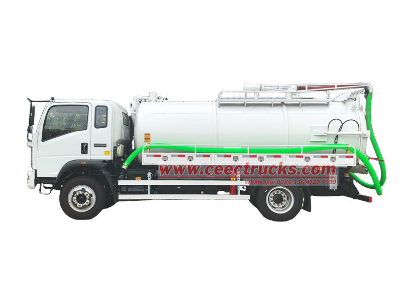 Одноосный септик Howo объёмом 5000 литров изготовлен на шасси Howo 4x2 с колёсной базой 4200, оснащён дизельным двигателем YC4E160-33 мощностью 160 л.с. и коробкой передач HW90510C2, 10 передач переднего хода и 2 передачи заднего хода, рабочим объёмом 4,257 л (эквивалент Euro 3), 7-штучными шинами 8.25R20. Он отличается высокой мощностью и простотой эксплуатации. Бак изготовлен из высококачественной углеродистой стали и оснащён высокоэффективным вакуумным насосом, обеспечивающим самовсасывание, самоопорожнение и саморазгрузку.