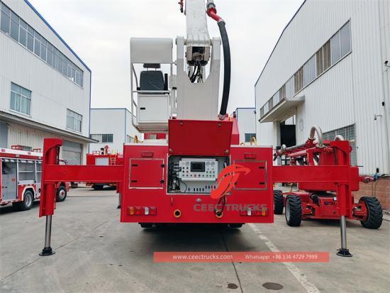 Трубопровод системы противопожарной защиты представляет собой трубопровод из нержавеющей стали + трубопровод из алюминиевого сплава. Водопровод достигает верхнего транспортного средства через центральный вращающийся корпус, который может удовлетворить потребности в подаче воды или пены. На верхней головке рычага имеется электрическая дистанционно управляемая водометная пушка, которая может изменять форму потока воды (прямой и брызги воды) и может распылять воду или пену. В нижней части транспортного средства имеется водозаборник для удовлетворения требований пожаротушения с большим потоком высотных зданий.