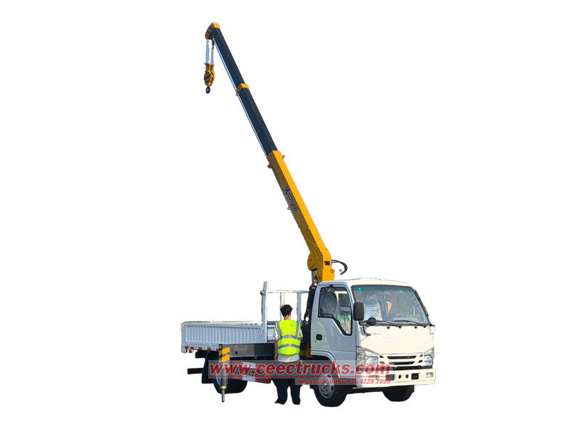 Кран может Для выбора вы можете выбрать кран с прямой или складной стрелой. Кран-манипулятор Isuzu на грузовом автомобиле состоит из стрелы, поворотной платформы, рамы, ножек и других частей.