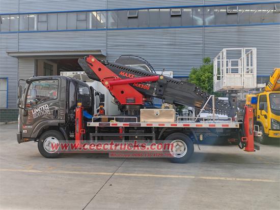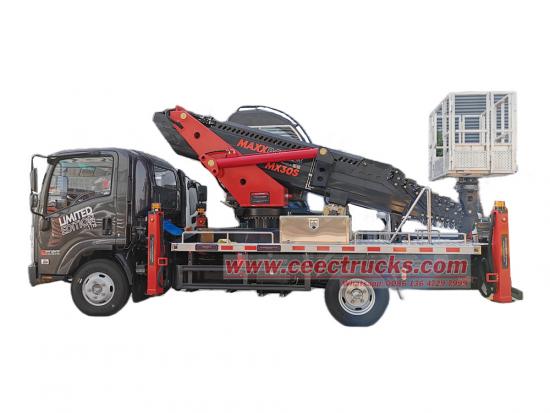 Автовышка Isuzu KV100 30 м модифицирована на базе шасси Isuzu KV100, колесная база 3815 мм, общая масса 8280 кг, оснащена двигателем Isuzu 4KH1CN6HB 132 л.с. Euro VI, 6-ступенчатой коробкой передач Isuzu MLD, верхняя часть представляет собой 8-секционную 18-гранную синхронную телескопическую стрелу, максимальная высота подъема составляет 30 метров, максимальный рабочий радиус составляет 12 метров, вся машина оснащена четырьмя гидравлическими телескопическими опорами (телескопические вверх и вниз и горизонтальные телескопические) и в общей сложности восемью цилиндрами, передние X-образные, задние H-образные, индивидуально регулируемые, аварийный насос, вращение рабочей платформы на 360 градусов, ограждение из алюминиевого сплава, узорчатые противоскользящие дорожки, номинальная грузоподъемность ковша 200 кг, может управляться из кабины поворотного круга, наземный пульт управления, беспроводной пульт дистанционного управления.